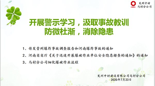 馬村分公司于7月23日下午在會(huì)議室舉行了“開(kāi)展警示學(xué)習(xí),汲取事故教訓(xùn),牢筑安全防線”的會(huì)議,會(huì)議為大家轉(zhuǎn)發(fā)了《貴州凱里市舟溪鎮(zhèn)“3.19”較大爆炸事故調(diào)查報(bào)告》及河南欒川縣爆炸事故有關(guān)情況、河南省省廳《關(guān)于迅速開(kāi)展爆破作業(yè)單位安全隱患排查的通知》。同時(shí)為了認(rèn)真貫徹“安全第一、預(yù)防為主”的方針,切實(shí)做好現(xiàn)場(chǎng)安全爆破作業(yè),并規(guī)范管理使用民用爆炸物品的工作,從根本上消除爆破安全隱患,杜絕爆破事故的發(fā)生,實(shí)現(xiàn)安全生產(chǎn),馬村分公司參會(huì)人員學(xué)習(xí)爆破作業(yè)安全規(guī)程的相關(guān)知識(shí)。 學(xué)習(xí)完調(diào)查事故報(bào)告及相關(guān)通知后,分公司涉爆人員紛紛根據(jù)自身工作情況結(jié)合學(xué)習(xí)內(nèi)容積極展開(kāi)自查自糾活動(dòng),其中結(jié)合分公司公司實(shí)際,管理人員提出以下問(wèn)題: 分公司執(zhí)行經(jīng)理劉黨提出:一是現(xiàn)場(chǎng)涉爆人員在卸載炸藥時(shí),要輕拿輕放,避免炸藥和地面石塊等發(fā)生碰撞,產(chǎn)生火花發(fā)生殉爆;二是在制作起爆器材時(shí),用木棍先在乳化炸藥包裝上扎眼,再插入電子雷管,禁止用金屬物件,以免發(fā)生安全隱患。 經(jīng)理助理曲光澤提出:一是在民爆物品審批時(shí),一定要按照打孔孔數(shù)申報(bào),提前規(guī)劃、計(jì)算好需要的數(shù)量,防止數(shù)量過(guò)多,以免后續(xù)存在安全隱患;二是有爆破作業(yè)時(shí),一定按照河南省公安下發(fā)的通知,爆破工程技術(shù)人員、爆破員(2人)、安全員及保管員(2人)及時(shí)到位,履行各自的職責(zé),并及時(shí)拍照上傳給公安機(jī)關(guān)。 安全員王建平提出:爆破現(xiàn)場(chǎng)要及時(shí)做好安全警戒,用警戒繩劃出爆破范圍;并且爆破作業(yè)區(qū)域內(nèi)禁止吸煙、攜帶打火機(jī),并要求現(xiàn)場(chǎng)人員相互監(jiān)督,及時(shí)制止不安全行為,消除一切安全隱患。 最后由項(xiàng)目經(jīng)理李文軍做最后總結(jié),先是通過(guò)對(duì)貴州凱里市舟溪鎮(zhèn)“3.19”較大爆炸事故調(diào)查報(bào)告的學(xué)習(xí),大家要學(xué)習(xí)“四不放過(guò)”原則,深刻汲取事故教訓(xùn),防微杜漸,消除隱患。并且著重強(qiáng)調(diào)安全無(wú)小事,尤其是涉及到爆破作業(yè),更要小心謹(jǐn)慎,時(shí)刻謹(jǐn)記“四不傷害”原則,保證自己的安全也要保證他人的安全。更要注意細(xì)節(jié),從民爆物品的審批開(kāi)始,必須有申請(qǐng)單,根據(jù)炮孔總米數(shù)計(jì)算藥量,爆破工程技術(shù)人員審批后,才可以進(jìn)行民爆信息平臺(tái)的申請(qǐng),后續(xù)的領(lǐng)用、發(fā)放,裝卸,裝藥、填塞,警戒,起爆,爆后檢查等一系列流程,都要保持著細(xì)心、小心、耐心的態(tài)度進(jìn)行各自的工作。同時(shí)要求分公司涉爆人員根據(jù)自己的崗位,細(xì)化流程,盡早擬定一份爆破作業(yè)流程,供分公司人員學(xué)習(xí)。