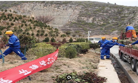 在植樹現場中,迎著朝陽,大家早早地來到了植樹地點,熱情高漲、干勁十足的投入到植樹活動中,大家自發組成三五人一組,分工協作,副經理楊宇說道:“樹苗植于土,綠色礦山理念植于心。”經由每一位職工的雙手,顆顆樹苗種下,勾勒出一幅美麗的早春景色。在大家辛勤勞動下,一排排的冬青樹苗扎根沃土,昂首挺立,展現出勃勃生機。