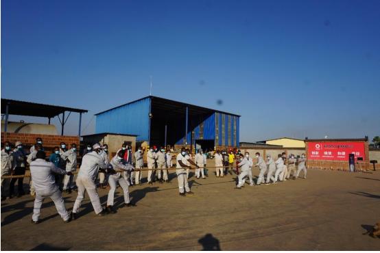 舉行以各生產(chǎn)部門為團(tuán)隊(duì)的拔河比賽,圖片為中方員工組成團(tuán)隊(duì)與贊方員工比賽圖。